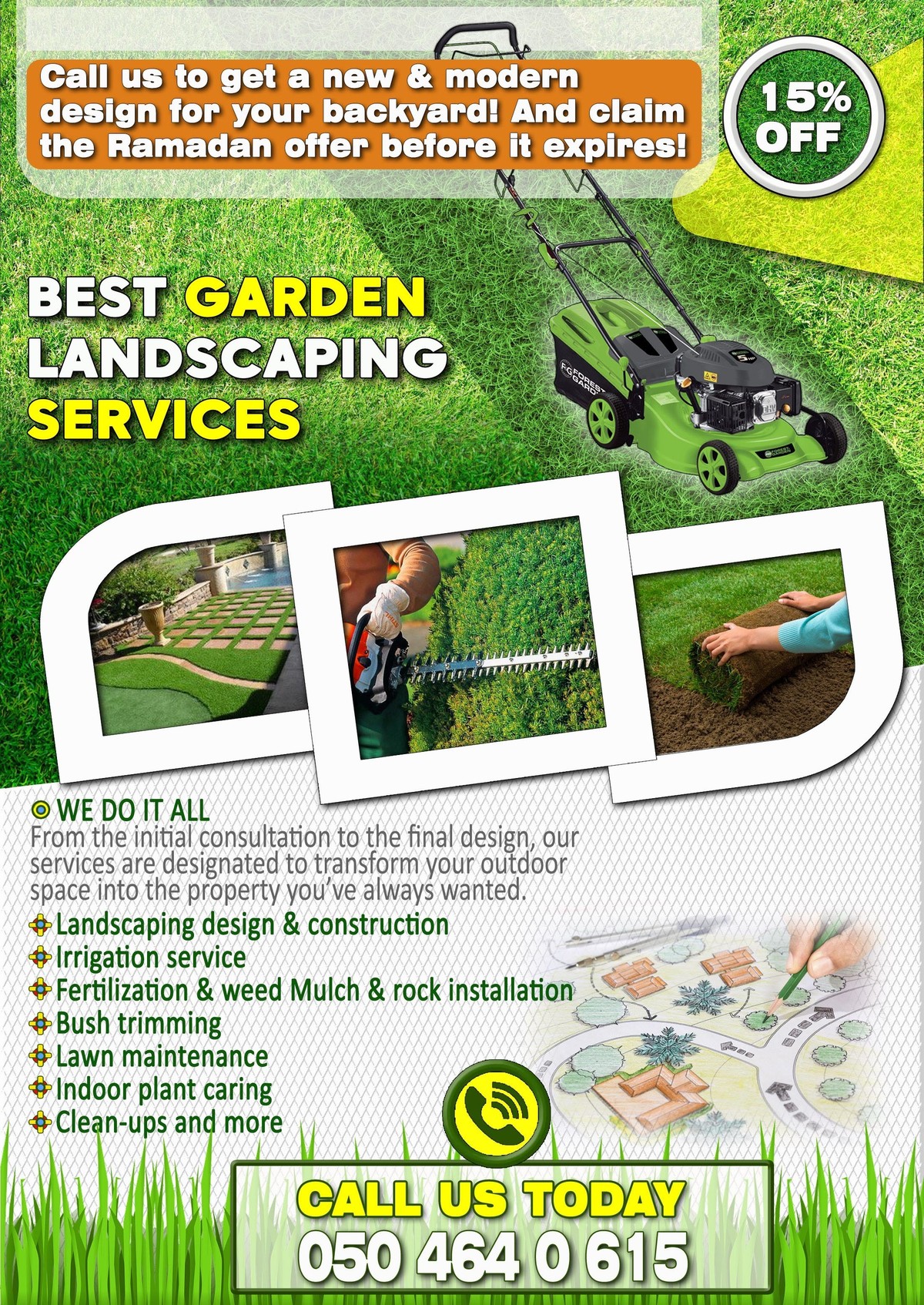 اتصل بنا للحصول على تصميم جديد وحديث لحديقتك والمساحة الخارجية لمنزلك وباسعار تبداء من 1200 درهم ! وطالب بعرض رمضان قبل انتهاء صلاحيته !